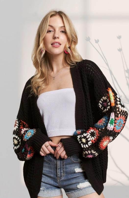 Our long sleeve black crochet cardigan is the perfect addition to any wardrobe.