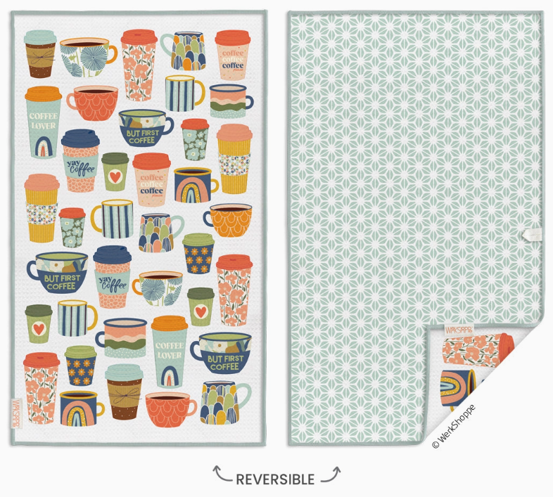 A colorful array of coffee cups in different shapes and patterns adorns this microfiber hard-working towel. It reverses to a graphic coffee bean starburst design on the other side.