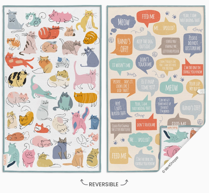 A whimsical design that's sure to bring a smile to all cat lovers. On one side, an adorable assortment of cats with personalities and on the reverse side, what they'd say if they speak our language.