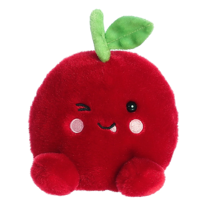 Cordial Cherry stands out with his plush, rich red body and a vibrant green leaf on top, symbolizing his freshness and vitality. His wide, welcoming smile and sparkling eyes make him a reassuring presence, always ready to lend a hand or an ear.