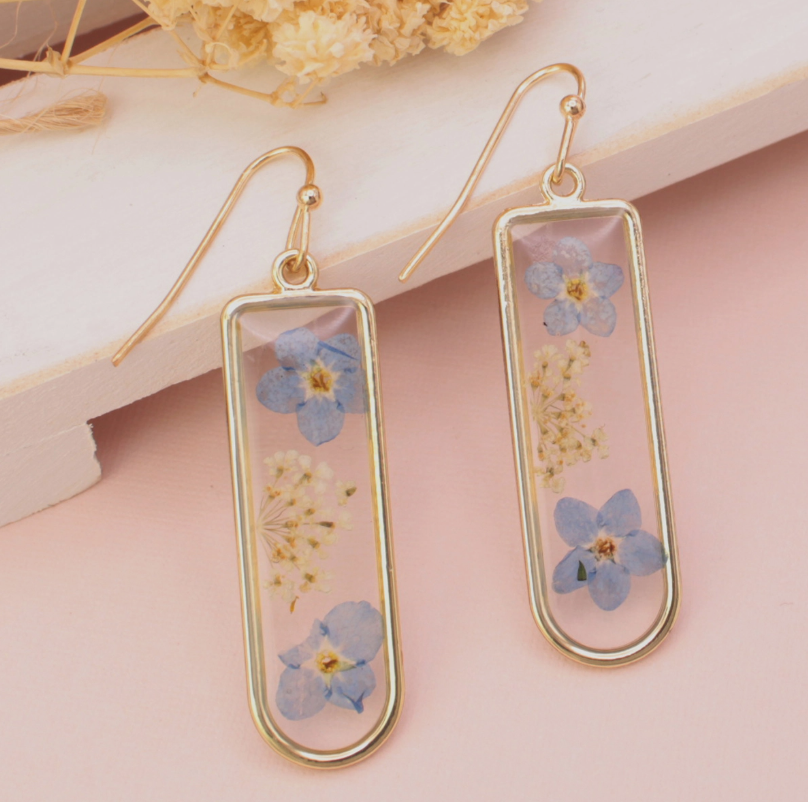 Bring nature indoors with these gold rounded bar earrings, featuring real delicate light blue and white dried flowers. Vintage, artistic and full of botanical charm, they’re perfect for plant lovers, boho vibes and adding a subtle, earthy statement. Wear a little garden magic wherever you go!