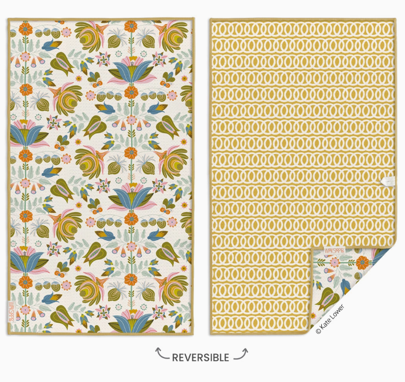 With the stylistic influence of the arts and crafts movement, this delicate floral pattern pairs nicely with a contrasting reversible side of simple interlocking circles to create a beautiful two-sided microfiber towel.