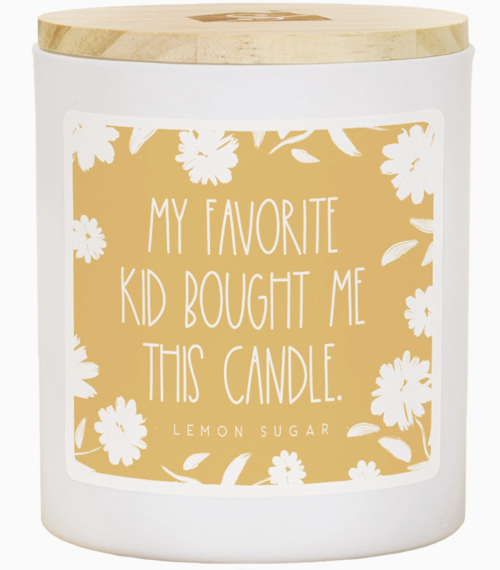 Soy wax jar candle with lemon sugar scent and humorous parent-themed message.