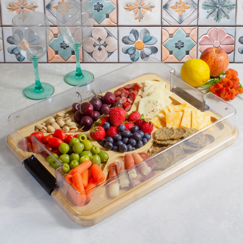The BPA-free locking lid secures to either side, so you can build a board at home and confidently take it to a picnic, potluck, or party. It’s fridge-safe too, great for keeping snacks and leftovers fresh!
