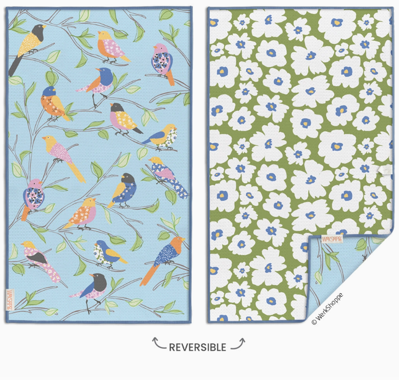 Birds of a feather come together with patterned finches perched on branches on one side and a contemporary floral pattern on the other completes the look of this reversible microfiber hard-working towel.