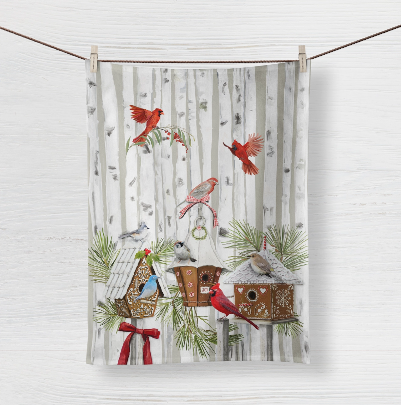 Add a festive touch to your kitchen with our "Ginger Bird Tea Towel." Featuring a delightful scene of colorful birds gathered around charming gingerbread-inspired birdhouses, this tea towel is a celebration of the holiday spirit and the beauty of nature.