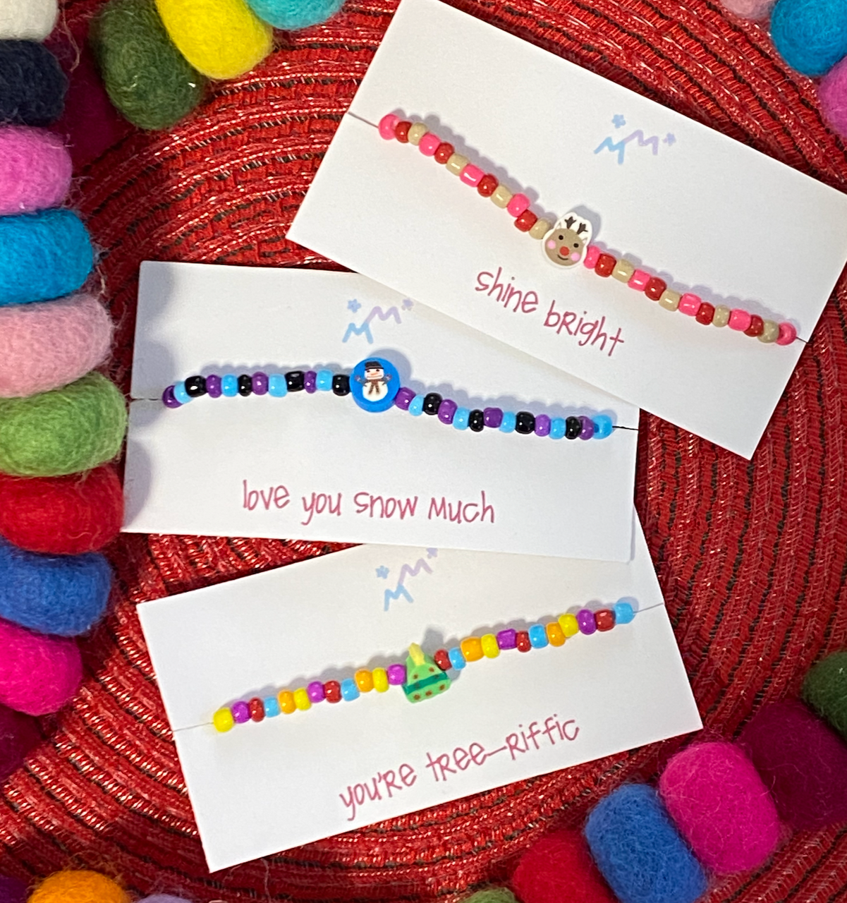 A sweet little reminder this holiday season. These cuties are made by my eleve year old daughter, Marlo. Each one is handmade and one of a kind. The bracelets are stretchy and comfortably fit a 6-7" wrist.