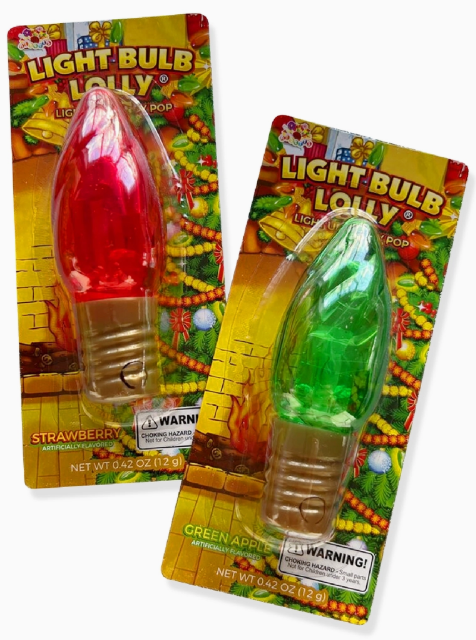 The Only Time It’s Okay to Lick a Light Socket ?? Who needs boring old twinkle lights when you can literally light up the room with your candy? Introducing Light Bulb Lollies—part sweet treat, part toy, part “Wait… is that thing glowing?!” These festive baddies are shaped like your favorite retro Christmas bulbs, but plot twist: they’ve got strawberry or sour green apple lollipops hiding inside. Press the button, and BAM—they light up brighter than Cousin Eddie's house in Christmas Vacation.