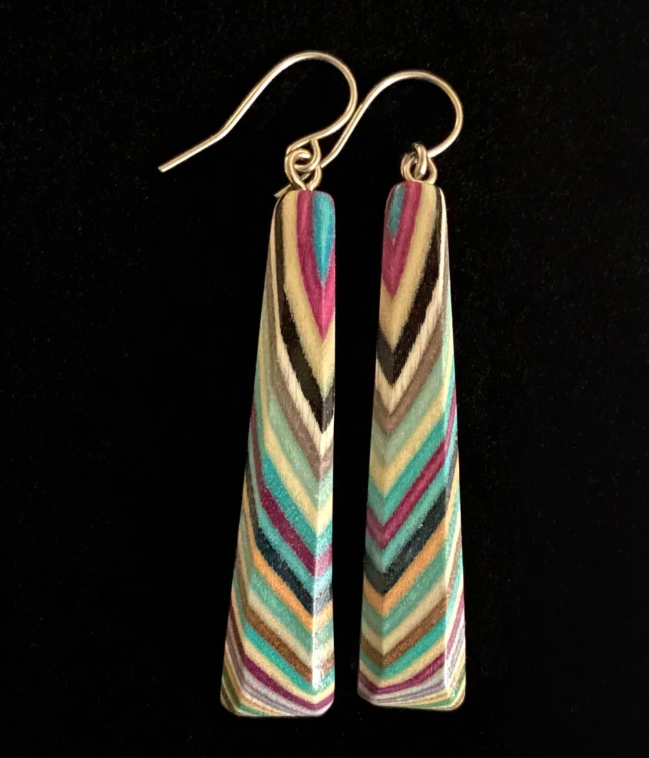 These lightweight and colorful wood earrings are handcrafted from unique combinations of dyed and natural hardwood — every color you see is a different piece of wood. Earrings are individually cut, sanded, and lacquered. There are about 50 steps in all.