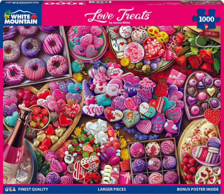 Love Treats. Cupcakes, cookies, chocolate and more. When stumped about what to give your love give them love treats. Artist Jessica White created this 1000 piece collage style jigsaw puzzle with love and an empty tummy in mind.