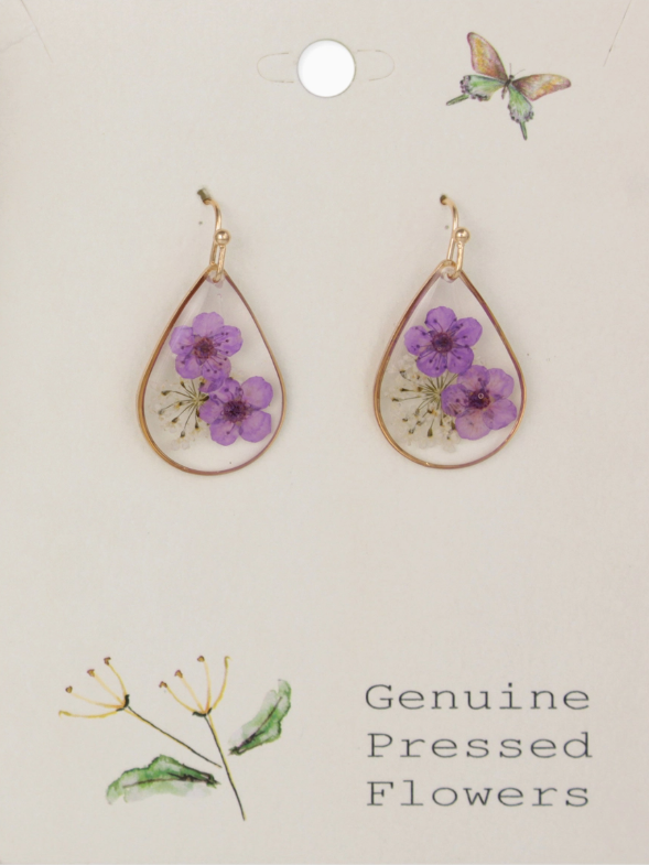 Delicate, dreamy, and full of charm! These gold small teardrop earrings cradle light purple and white dried flowers in a dainty, elegant design. The dried flowers encased in clear acrylic will delight floral lovers, boho fashion fans, or anyone craving subtle, nature-inspired cottage vibes. Bring garden fresh magic to your everyday look