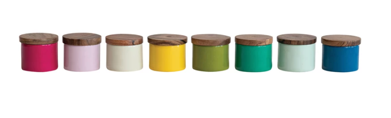 1-3/4" Round x 1-3/4"H Enameled Metal Mini Pinch Pot w/ Acacia Wood Lid, 8 Colors.