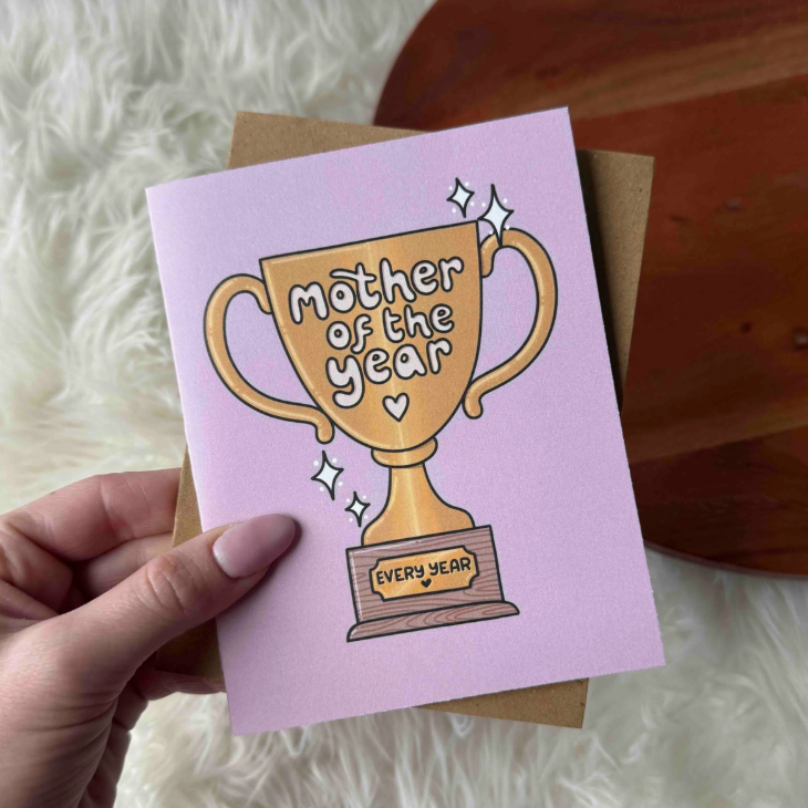 Hand-drawn greeting card featuring a colorful Mother of the Year trophy design