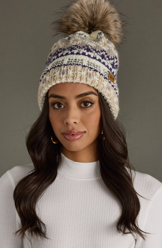 Our patterned pom hats will keep you warm when the cool weather hits.