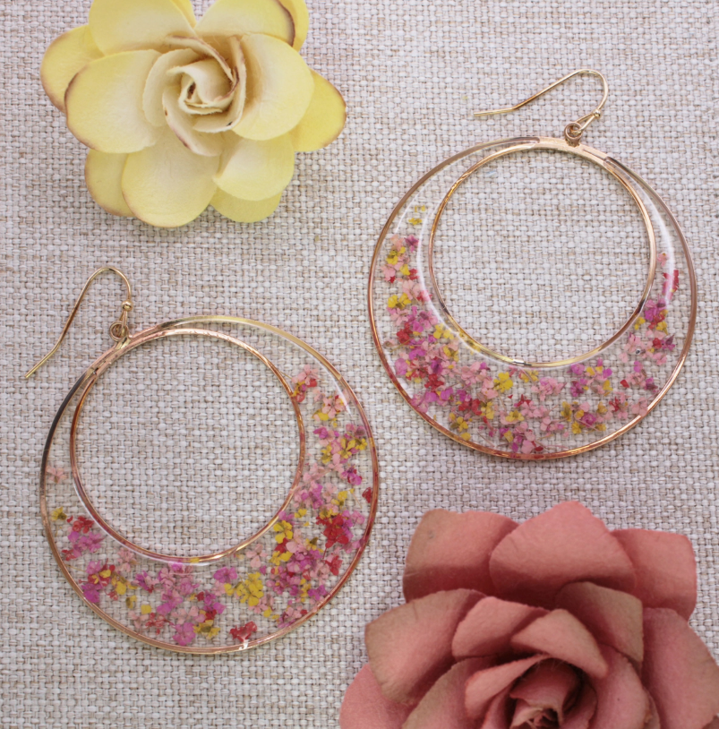 Channel garden goddess energy with these large round crescent earrings, bursting with real pink dried flowers. The dreamy floral design is set in a clear acrylic for a magical, nature inspired vibe. Fresh, bold, and whimsical, perfect for spring days, sunny strolls, or anytime you want to bloom bright. Floral statement earrings with a crescent twist!