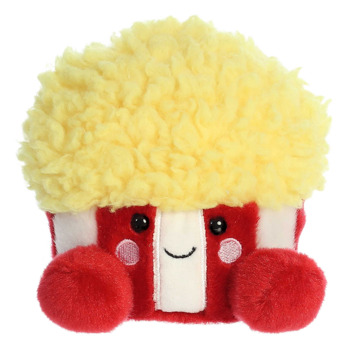 Butters is a fluffy, buttery-yellow plushie with a puffy popcorn top, cuddled up in a bright red and white striped box.