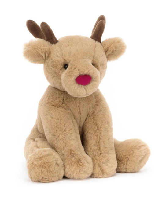 Romi Reindeer brings sleigh-loads of festive joy. This scrumptious honey deer has huge weighted paws and suedette antlers in rich cocoa tones – not to mention their delicate tufty tail, cranberry nose and waggle ears. A Christmas companion for long drives and post-dinner naps.