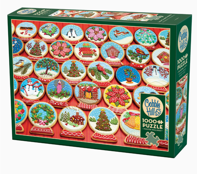 Snow Globe Cookies 1000 Piece Puzzle! Let snowflakes fall, and turn your wintertime blues into a sweet treat of fun! Enjoy beautiful snowy scenes, wreaths, Christmas trees, and poinsettias – everything you need to create a winter wonderland in your own home.