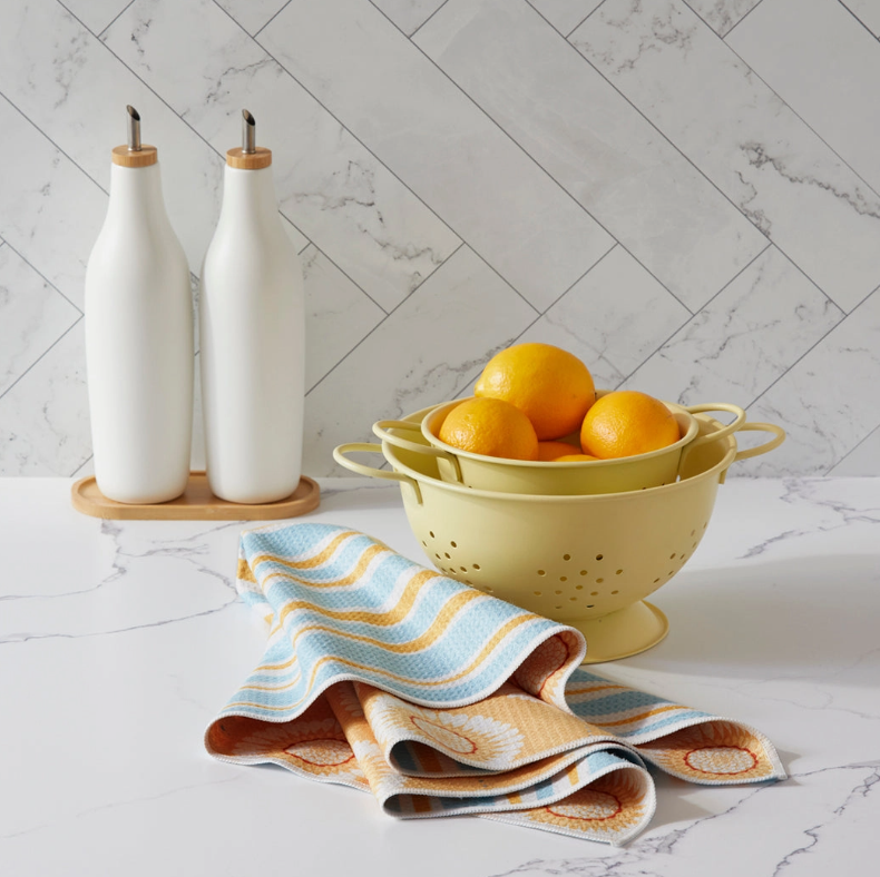 Bright as a sunflower, our "Sunflower Chains" microfiber kitchen towel will brighten up your kitchen space. Hands down, these high-performance, eco-friendly microfiber towels are clean-up marvels. An optimized, waffle weave material blend makes these towels ultra-absorbent and quick drying. And that’s not the half of it. Each reversible towel has not only one but two gorgeous works of art to brighten your workspace, not to mention your mood.
