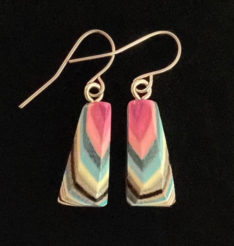 These lightweight and colorful wood earrings are handcrafted from unique combinations of dyed and natural hardwood — every color you see is a different piece of wood. Earrings are individually cut, sanded, and lacquered. There are about 50 steps in all.