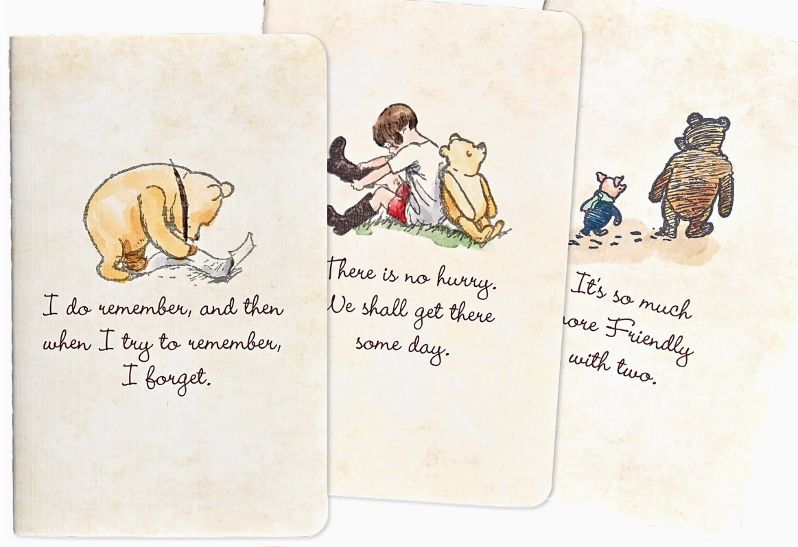 The cover of each notebook features a charming Winnie-the-Pooh design featuring A. A. Milne's beloved characters, as illustrated by Ernest H. Shepard.