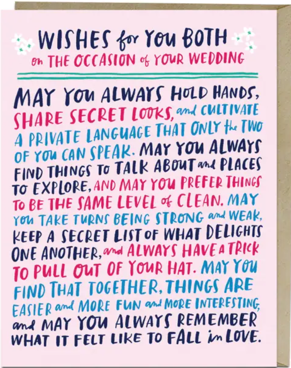 If you’re having trouble finding the right words for your friends who are about to wed, this card weaves together a wealth of knowledge and well-wishes for couples about to embark on that wonderful journey.