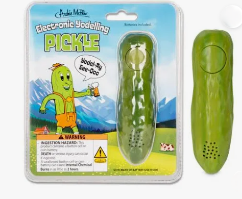 Are you sick and tired of trying to convince a jar of pickles to yodel using melodious mind bullets and sheer force of will? So were we. At last, the Electronic Yodelling Pickle that you have always hoped for! Each 5-1/4'' long plastic pickle yodels its little heart out at the push of a button. Three LR44 batteries included.